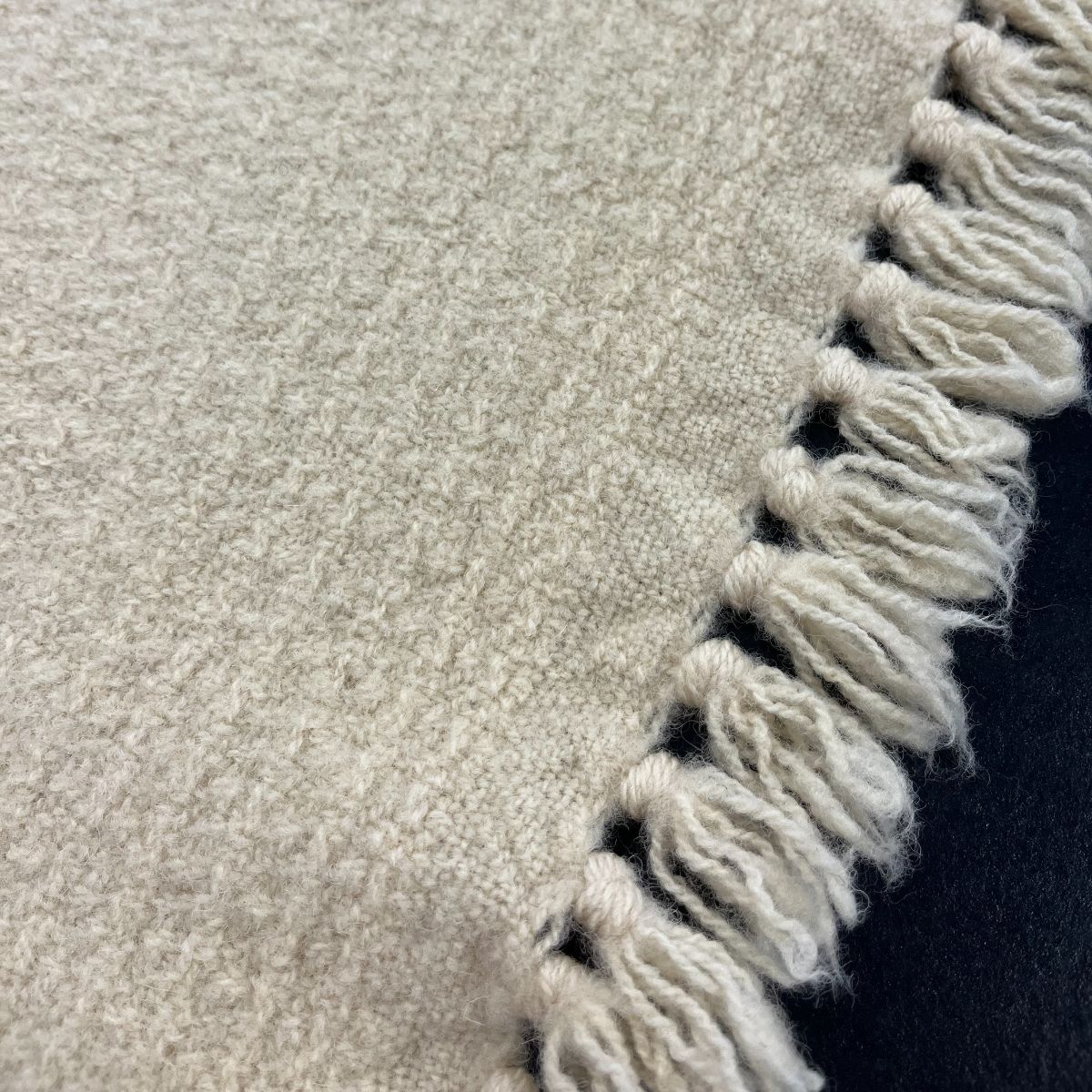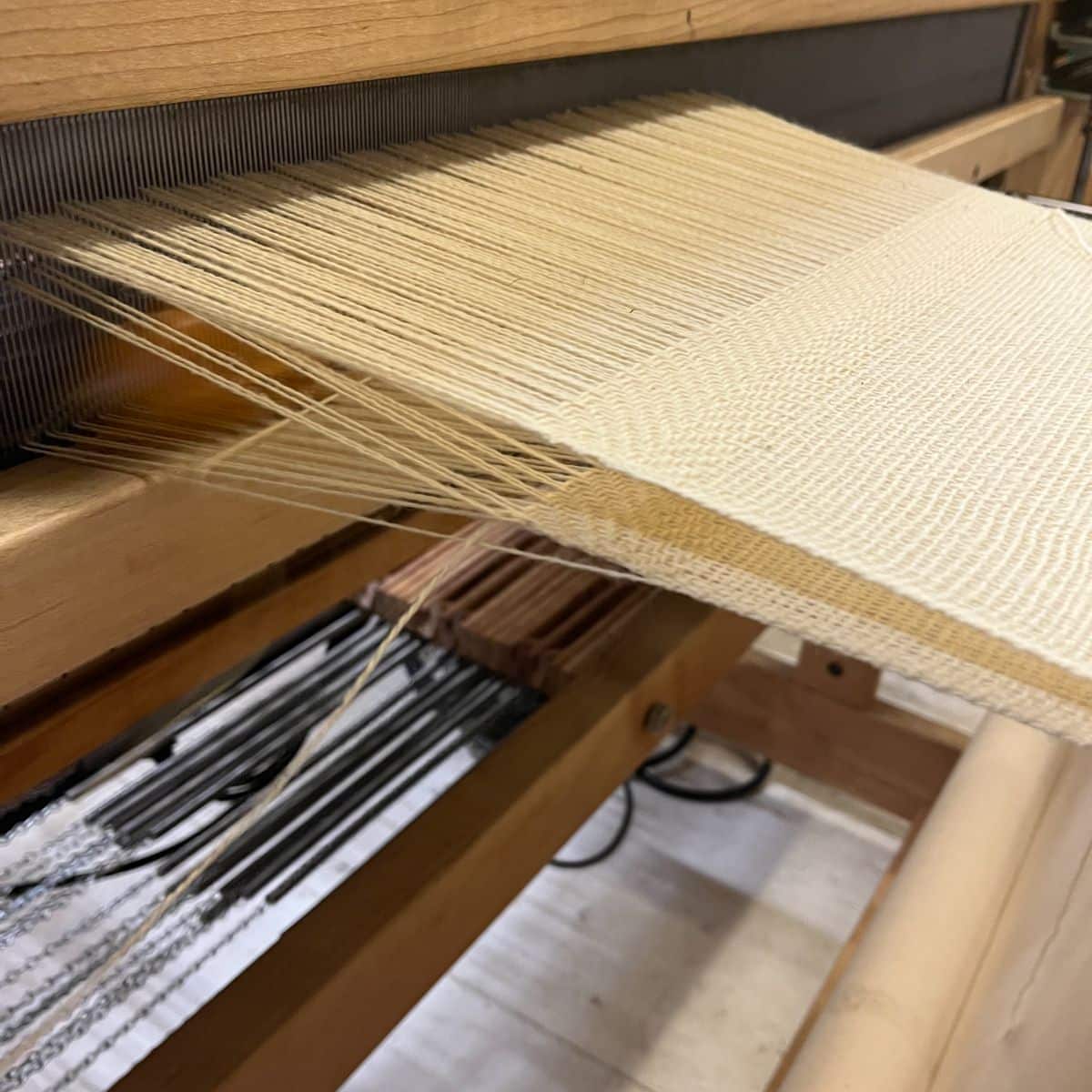 Nicholas worked on our 60-inch IDL power loom to create our mill’s first Queen size woven wool blanket! This beautiful, cream coloured blanket is woven from Ontario wool, hand-fringed, and incredibly soft!