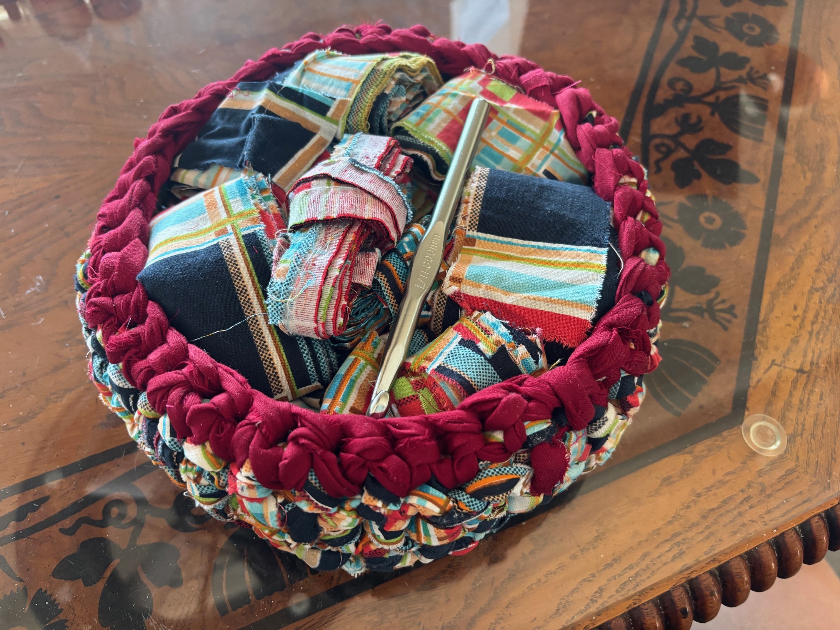 In April Makers gathered around the large work table upstairs at the Mill to create placemats, rugs, runners and baskets using only strips of scrap fabric and a large crochet hook.