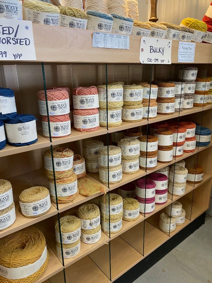 We have 100% wool yarn produced and dyed here at Wave Fibre Mill. All of our dyes are natural.